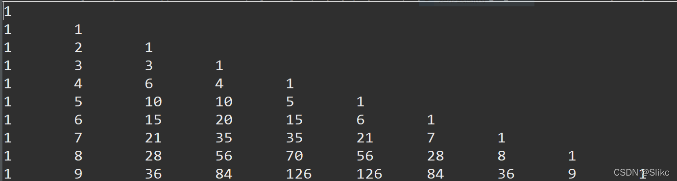 public class Yanghuisanjiao {//创建Yanghuisanjiao类public static void main(String[] args) {//主函数int[][] arr=new int[10][10];//定义一个二维数组,十行十列for(int i=0;i<arr.length; i++) {//循环遍历排序后的数组//由于只是给杨辉三角内的位置赋值,所以是j<=ifor(int j=0;j<=i;j++) {//控制长度if(j==0||j==i) {//判断条件arr[i][j]=1;//二维数组从1开始}else {//根据规律,使用if else 赋值arr[i][j]=arr[i-1][j-1]+arr[i-1][j];//控制行和列}System.out.print(arr[i][j]+"\t");//输出二维数组}System.out.println();//换行} }
