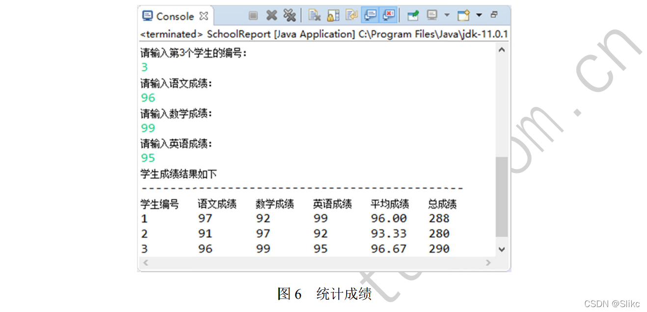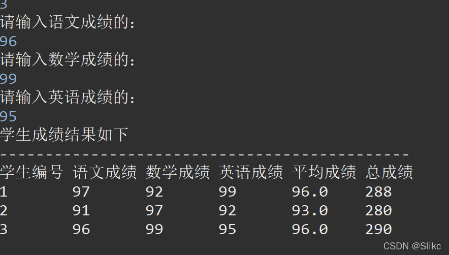 public class Tongjicj {//创建Tongjicj类public static void main(String[] args) { //主函数System.out.println("请输入第3个学生的编号:");//输出编号 Scanner scanner=new Scanner(System.in); //定义一个二维数组 int a=scanner.nextInt(); //存放数组元素System.out.println("请输入语文成绩:");//输出int b=scanner.nextInt(); // 存放b值System.out.println("请输入数学成绩:");//输出int c=scanner.nextInt(); // 存放c值System.out.println("请输入英语成绩:");//输出int d=scanner.nextInt(); // 存放d值int arr[]=new int [] {b,c,d}; //定义数组System.out.println("学生成绩结果如下");//输出System.out.println("---------------------------");//输出System.out.println("学生编号 语文成绩 数学成绩 英语成绩 平均分 总分"); //输出System.out.print(a+" ");//输出//输出int count=0; // 赋初值for(int i=0;i<3;i++){ //for循环count=count+arr[i]; //定义新数组 System.out.print(arr[i]+" ");//将新数组中每个元素输出 } double avg=0; //double型avg=(int)count/arr.length; //输出存放值 System.out.print(""+avg); //输出System.out.print(" "+count); //输出}}