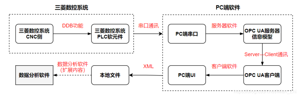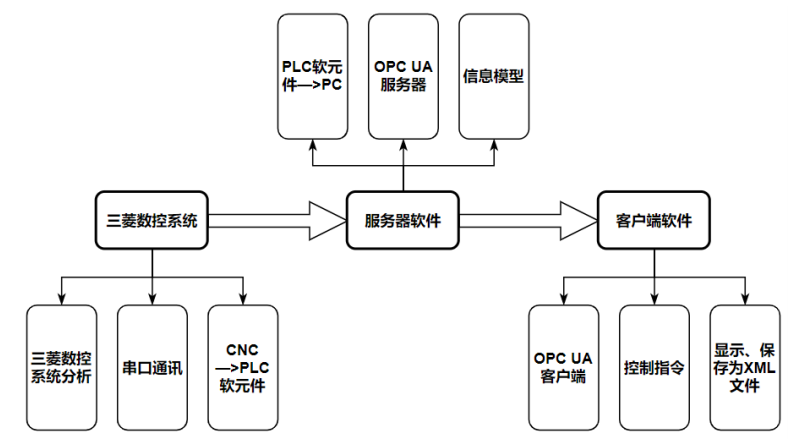 数据采集系统总体设计思路围绕数据流向展开,始于三菱数控系统 CNC 侧 或 PLC 侧,终止于本地储存文件,具体流向如图所示。待采集的数据可能储存于 PLC 的软元件中,也可能保存在 CNC 系统中,这些数据大多可在机床显示面板上直接观察到,但对于实际应用来说只有将数据导出为可用文件或其他便于集成、储存、分析的形式才能发挥出更大作用。系统先利用 DDB 功能对 PLC 编 程,解决所需采集的数据从 CNC 到 PLC 的障碍,接着通过研究串口通讯将数据 采集至 PC 端;PC 端开发服务器软件将数据按需更新至 OPC UA 服务器信息模 型,供客户端随时读取;客户端软件登录至 OPC UA 服务器,实时获取节点信息 并显示在 UI(User Interface,用户界面),最后用户可选择将实时更新的数据按 设计好的 XML 格式保存至本地,供数据分析等软件进一步研究。