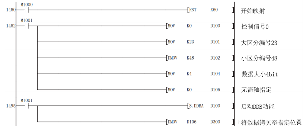 通过 DB20-DB9 通讯线将三菱 E60 系统的控制单元与 PC 端相连后便可实现串口通讯,用户可在 PC 端通过相关协议对控制单元中 PLC(可编程控制器) 里绝大多数输入输出、定时器、计数器、继电器和寄存器的值进行实时读取并用 于后续分析处理等。但对服务于制造过程中的数据采集系统而言,单纯这些数据是远远不够的,比起 PLC 中直接读取到的诸如照明灯、冷却液开启与否等信息, 工业现场更希望收集到如主轴实际位置、转速、电流负载等更为有用的制造信息。 而此类信息大多无法在 PLC 的 软元件里 直 接 读取 , 而 是 保 存 于 CNC (Computerized Numerical Control,计算机数控)系统中,需要将其先从 CNC 系 统导入到 PLC 的寄存器中才能利用上述串口通讯在 PC 端进行实时读取。对此, 三菱 E60 数控系统专门提供有 DDB (DirectDateBus)功能实现此操作,梯形图示例如下。