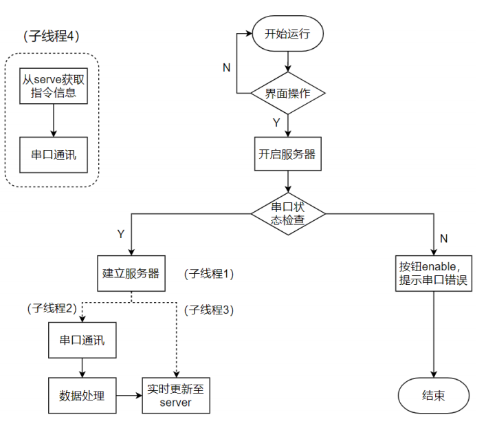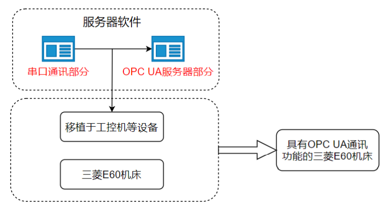 服务器软件的程序主要由串口通讯和 OPC UA 服务器两部分构成,前者主 要是通过将 ACT 控件转化而来的 C++源文件及头文件导入项目,以函数调用的 方式进行数据读取,值得注意的是不同数据信息所占内存大小不同,部分数据需 进行处理才可使用;后者则主要包括 OPC UA 服务器建立、信息模型设计和数据 更新等内容。在开发时还设计有上述简单界面用于调试,若在实际工厂中使用时 可将界面直接省去,整个服务器软件可脱离 PC 全部打包移植于树莓派或工控机 等设备,将设备安装于机床内部,上电即开始运行。此方式不仅完成了数据采集 任务,还对老旧机床的数字化改造具有重大推动作用。