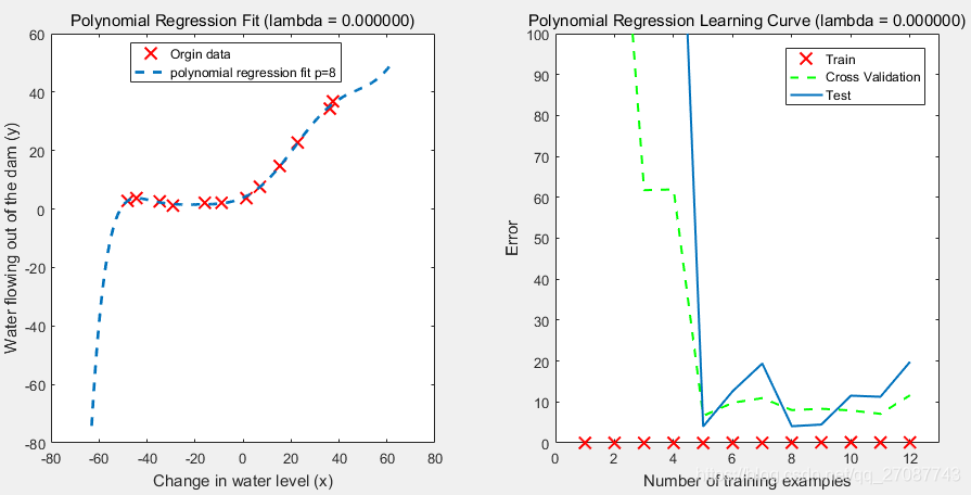 legend('Orgin data','polynomial regression fit p=8')subplot(1,2,2)