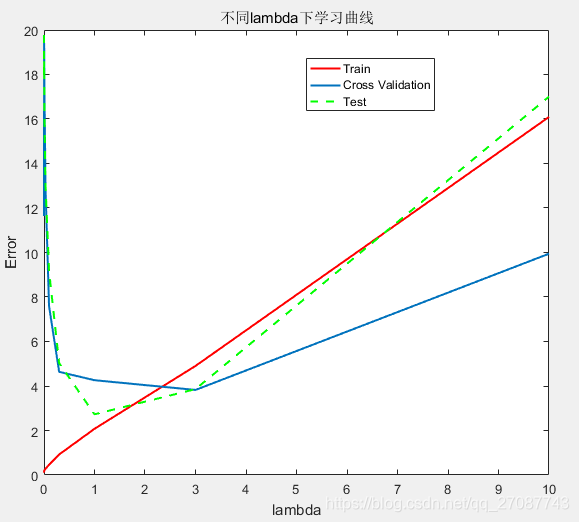 [lambda_vec, error_train, error_val,error_test] = ...validationCurve2(X_poly, y, X_poly_val, yval,X_poly_test, ytest);close all; plot(lambda_vec, error_train, lambda_vec, error_val, lambda_vec, error_test); legend('Train', 'Cross Validation','Test'); xlabel('lambda'); ylabel('Error'); - 结果