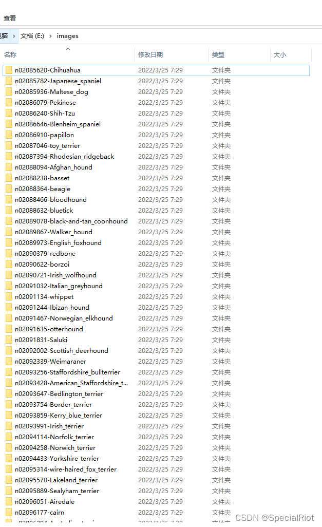 根目录下的文件夹以图片分类命名,按照顺序读取图片与文件分类可以用作神经网络等方面训练的数据集。文中数据集下载链接:http://vision.stanford.edu/aditya86/ImageNetDogs/images.tar