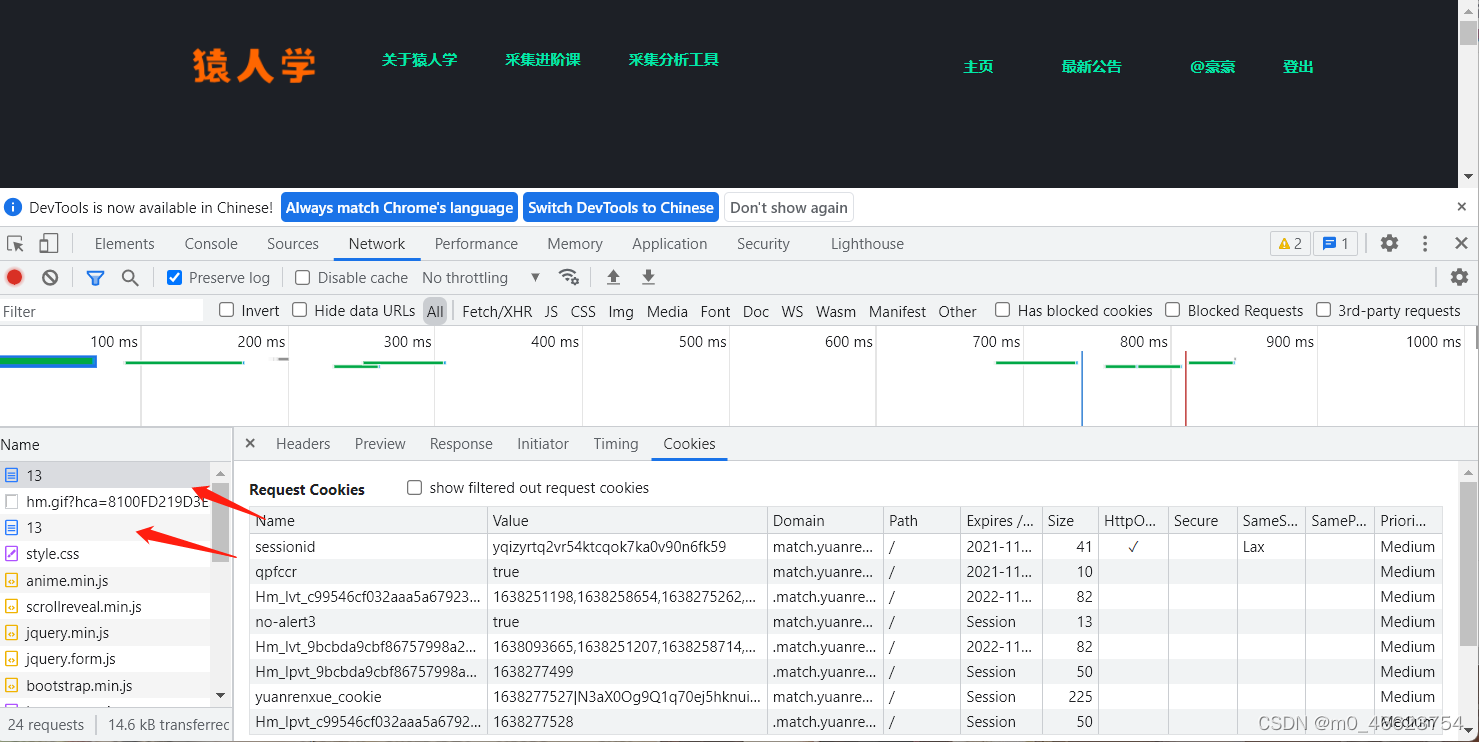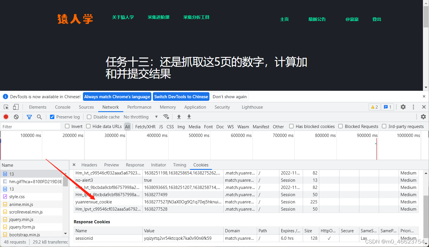 sessionid解决了,开始找除了hm开头的系统自带cookie跟数值为true不变的以外的cookie,还有一个yuanrenxue_cookie现在开始找
