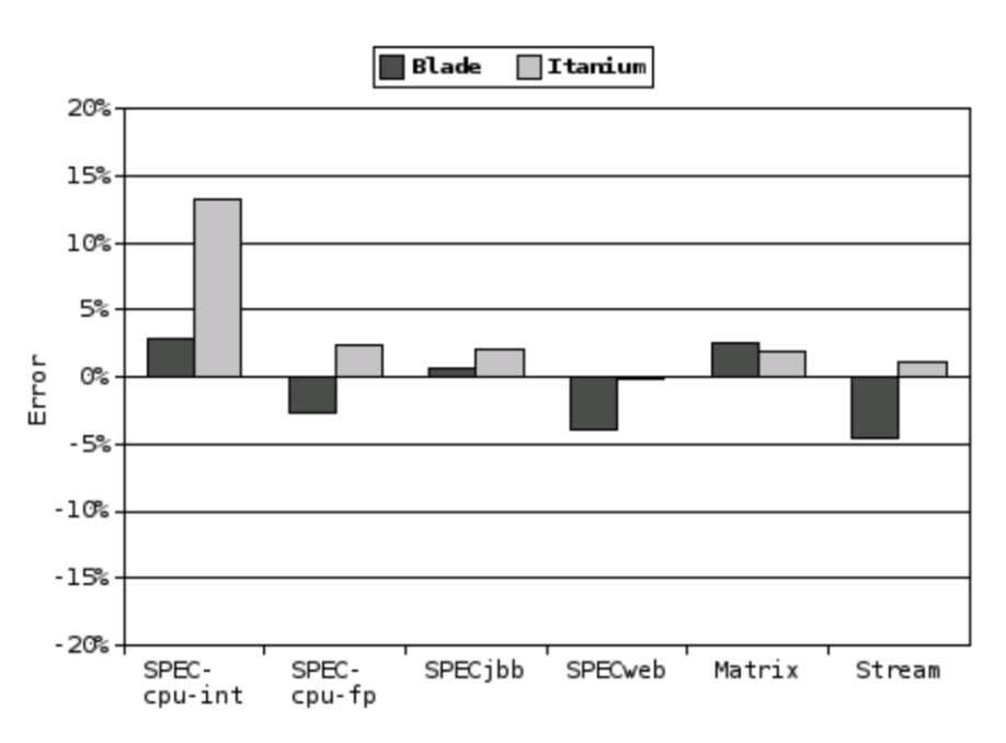 为了验证Mantis的功率建模方法,我们为刀片和Itanium服务器开发了Mantis模型,如上一节所述。 我们使用这些模型来估算运行各种应用程序的每个系统的功耗。 具体来说,我们使用了SPECcpu2000整数和浮点基准,SPECjbb2000,SPECweb2005,流基准和矩阵乘法。 总的来说,这代表了30多种不同的个人基准应用程序,涵盖了不同的计算领域(工作站,科学,企业),并强调了系统组件的不同子集。 所用应用程序的多样性对于模型的验证至关重要。 如果所有应用程序都来自单个域,则该模型可能缺少应用程序未执行的组件的关键参数。