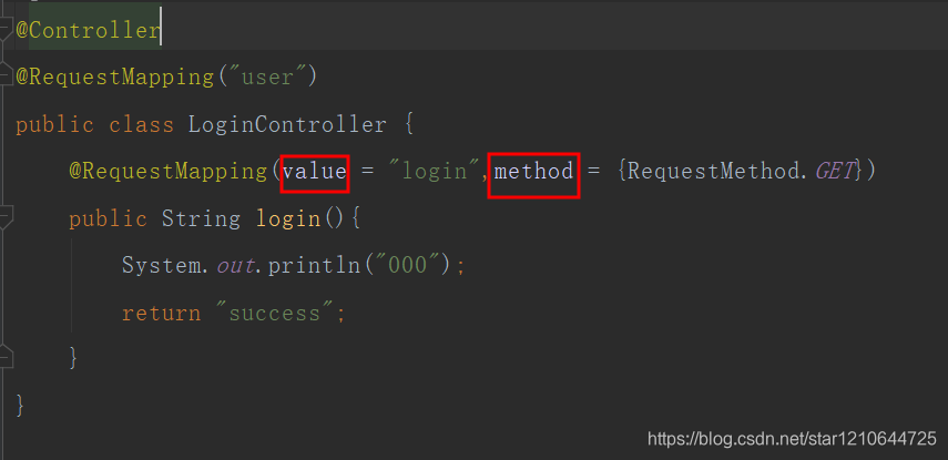 - method属性,它是用来指定请求的方式的,比方说,我只处理get请求,不处理post请求,就按照上图这样配置,如果处理多种类型的请求可以在数组中逗号隔开,去写。另外,RequestMethod类是枚举类,直接拿这个类点类型就可以了,就像 RequestMethod.GET