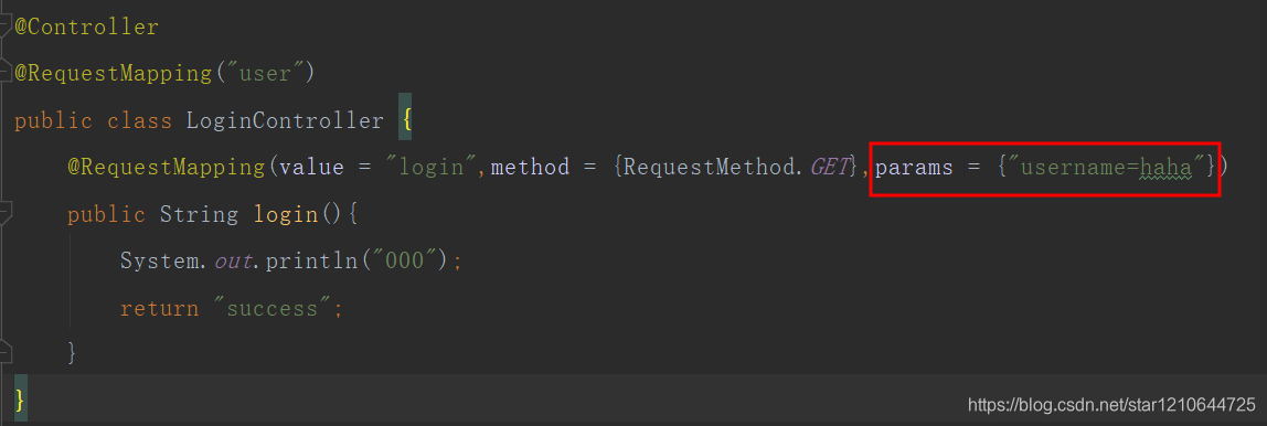 如果上边红框里的字符串只有username,这样就限定了,你必须给我传过来一个名字为username的参数。否则这个请求我不给你处理。如果还带了等号加后边的内容,就是限定了请求参数的值必须为这个内容。
