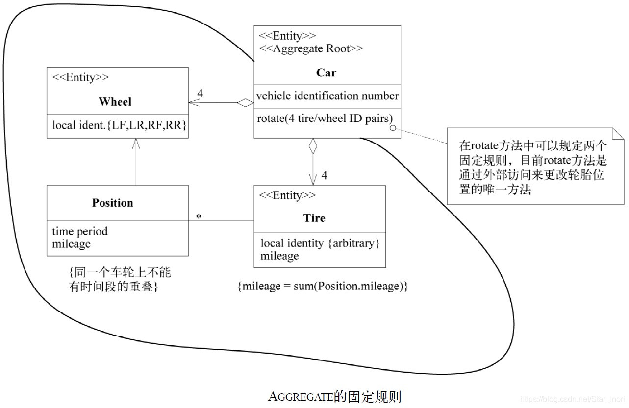 我们应该将ENTITY 和VALUE OBJECT 分门别类地聚集到AGGREGATE 中, 并定义每个AGGREGATE的边界。在每个AGGREGATE中,选择一个ENTITY作为根,并通过根来控制对边界内其他对象的所有访问。只允许外部对象保持对根的引用。对内部成员的临时引用可以被传递出去,但仅在一次操作中有效。由于根控制访问,因此不能绕过它来修改内部对象。这种设计有利于确保AGGREGATE中的对象满足所有固定规则,也可以确保在任何状态变化时AGGREGATE作为一个整体满足固定规则。