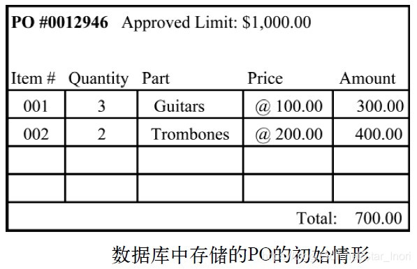 每个用户都将从数据库读取对象,并在自己的内存空间中实例化对象,而后在那里查看和编辑对象。只有当开始编辑时,才会请求进行数据库锁定。因此,George和Amanda可以同时工作,只要他们不同时编辑相同的采购项即可。一切正常,直到George和Amanda开始编辑同一个PO上的不同采购项,如下图所示。