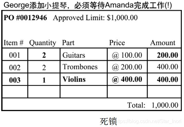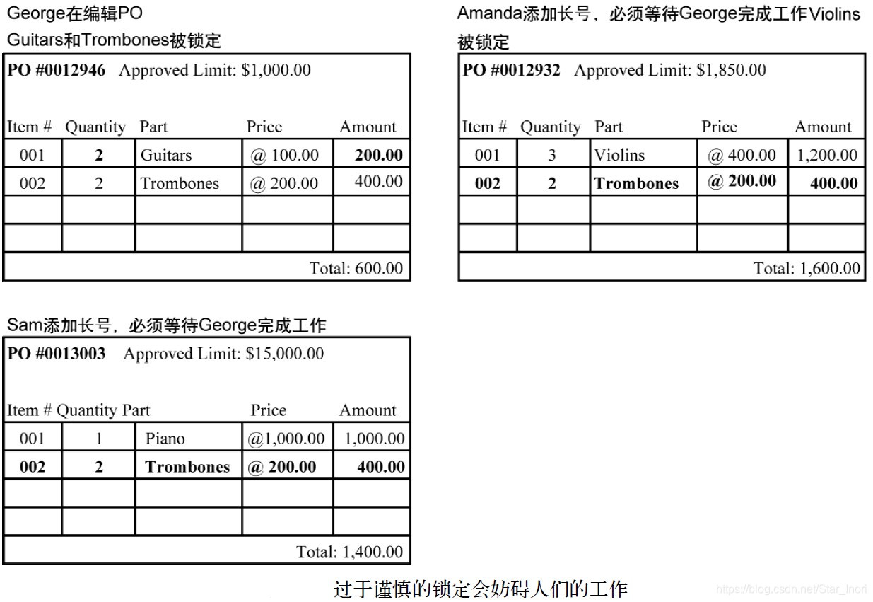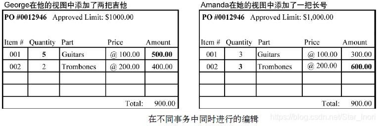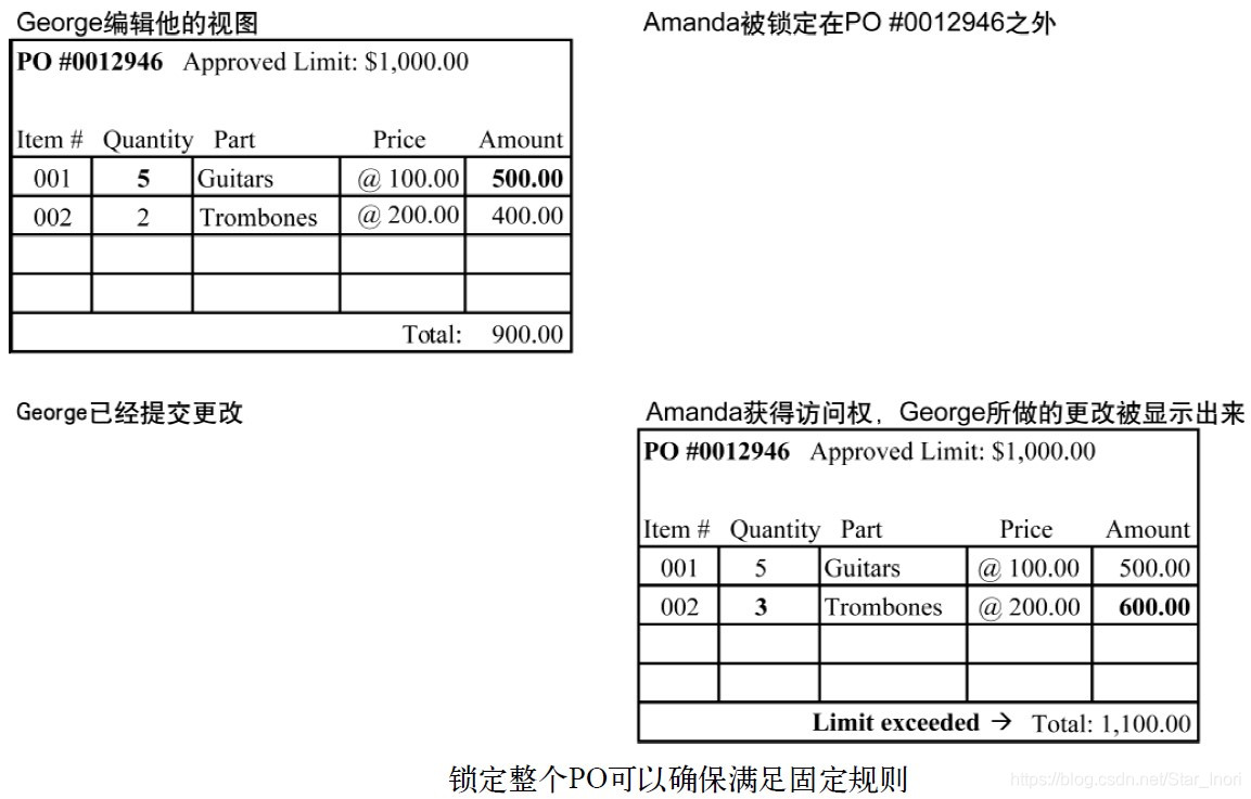 从这两个用户和他们各自软件的角度来看,他们的操作都没有问题,因为他们忽略了事务期间数据库其他部分所发生的变化,而且每个用户都没有修改被对方锁定的采购项。