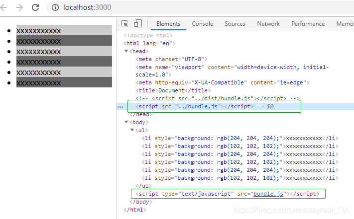 可以看到页面上有两个bundle.js,配置后它自动生成了一个在底部。所以html页面上写的引入script可以删掉。