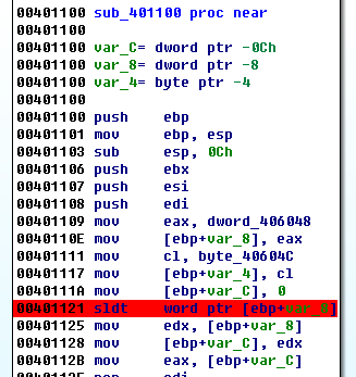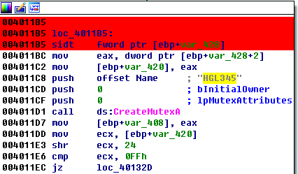 程序将sidt的运算结果保存到了var_420中。往下看,将var_420中的内容进行了逻辑右移24位,然后用这个结果与FF进行比较,如果相同就表明检测到了虚拟机,调用sub_401000来实现删除自身。