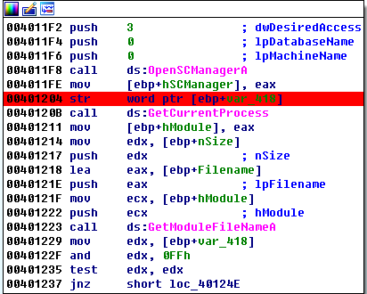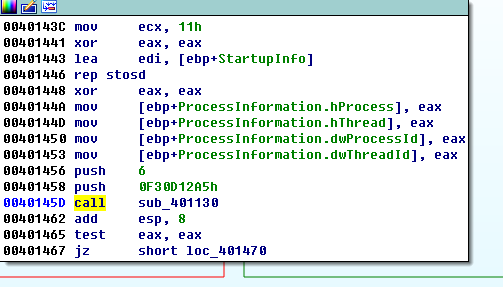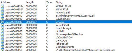 可以看到函数的两个参数分别是6和0F30D12A5h,用这两个参数与函数sub_401000的返回值进行比较,如果与0F30D12A5h相等,出现返回1,结束。这个恶意程序分厂巧妙的利用了替换技术,使用字符串哈希函数来替换vmware,达到混淆的目的。
