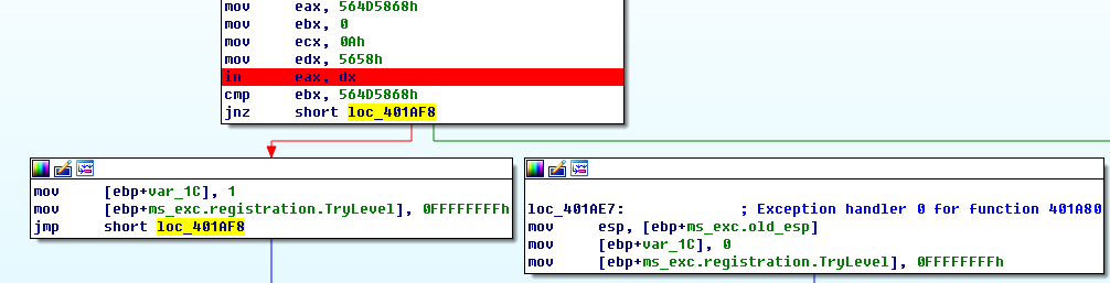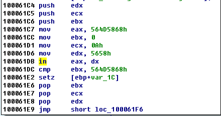 在这里可以很清楚的看到一个in指令,这个的目的就是来查询I/O通信端口。通过分析可以知道,恶意程序想用一个magic值来查看I/O通信端口的回应。