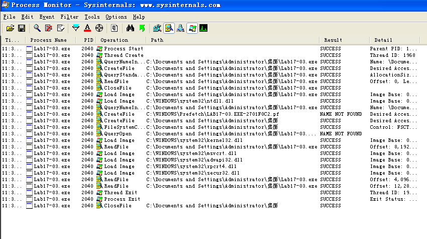 运行实验文件时使用Process Monitor进行监控,设置好筛选器,运行实验文件: