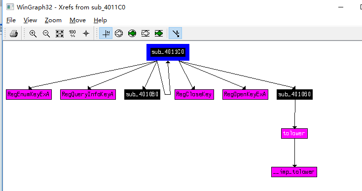 可以看到这是一个很明显的递归函数,还调用了一些其他函数,我们可以怀疑函数在注册表中递归检查字符串vmware,从而判定自身是否在虚拟机中。