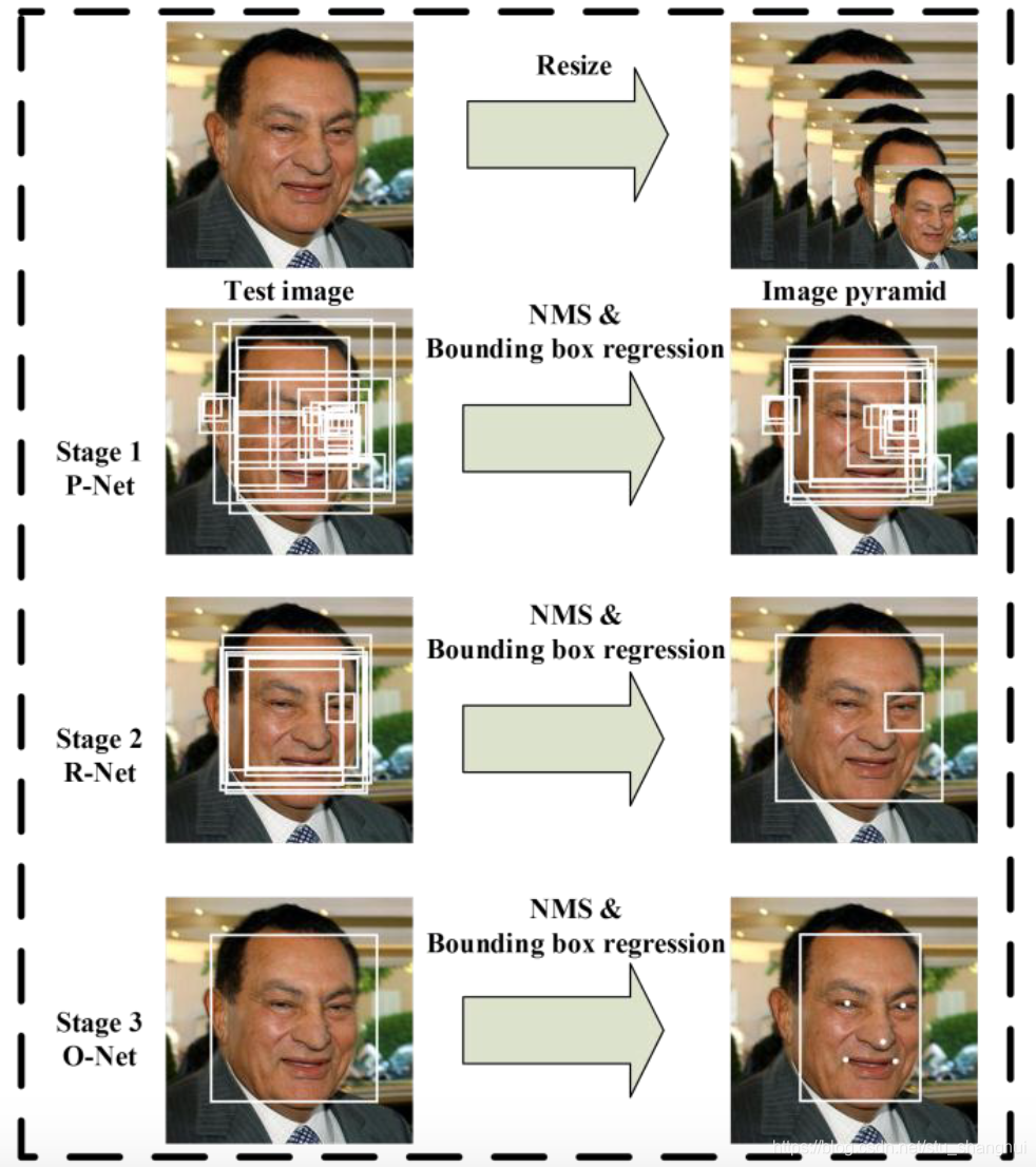 第一阶段会多次缩放原图得到图片金字塔,目的是为了让缩放后图片中的人脸与P-NET训练时候的图片尺度(12px * 12px)接近。