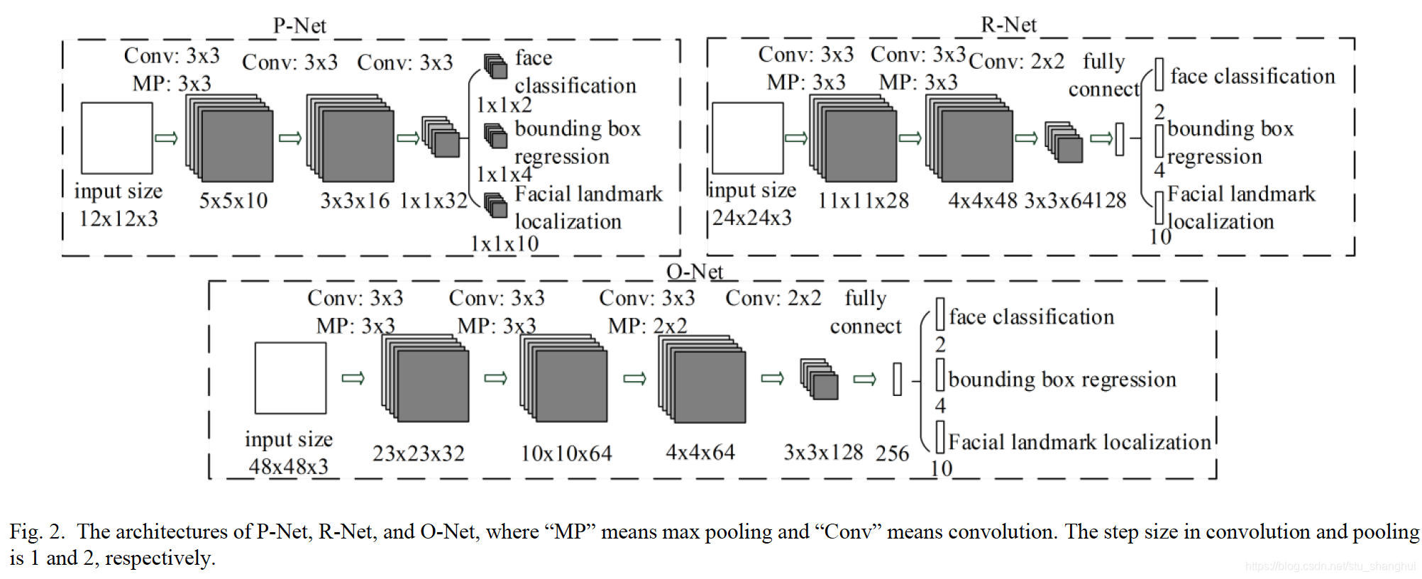 从上面的结构图中可以看到,三种网络结构非常相似,R-Net和O-Net中都有全连接,因此这两部分不能输入任意尺寸的图片。