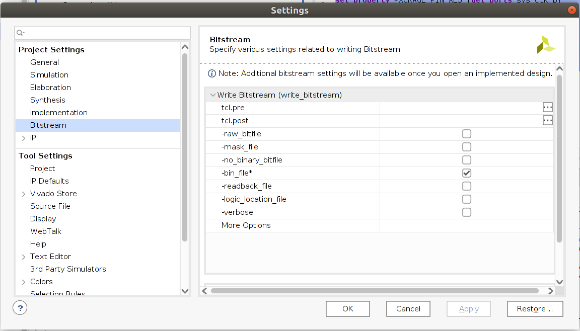 Vivado生成bin文件流程 : 点击Tools -->> Settings... -->>Project Settings -->> Bitstream