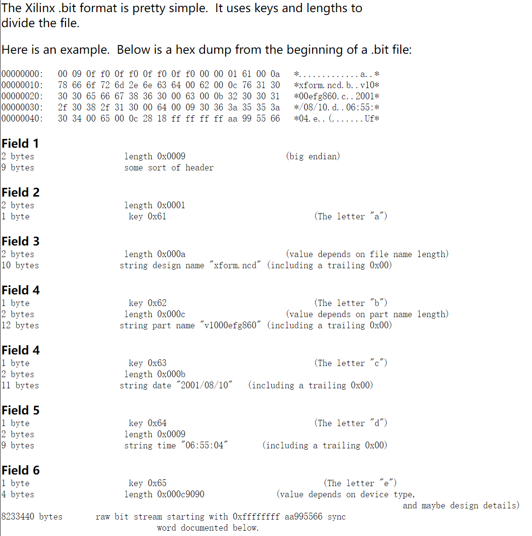 怎么解析bit文件头部信息获取bin文件长度,主要参考下面这个网址bit文件格式说明。