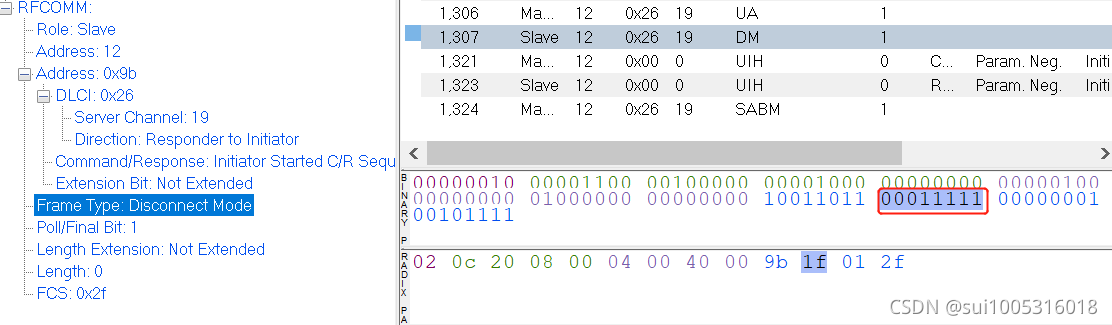 ②control字段是0x1f,即00011111,DM control字段的定义如下,master发送DISC时,设置的P位为1,所以这里F为也设置为1