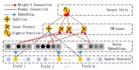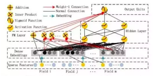 FM部分是一个因子分解机。关于因子分解机可以参阅文章[Rendle, 2010] Steffen Rendle. Factorization machines. In ICDM, 2010.。因为引入了隐变量的原因,对于几乎不出现或者很少出现的隐变量,FM也可以很好的学习。