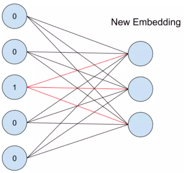 假设一个离散变量共有5个取值,也就是说one-hot之后会变成5维,我们想将其转换为embedding表示,其实就是接入了一层全连接神经网络。由于只有一个位置是1,其余位置是0,因此得到的embedding就是与其相连的图中红线上的权重。