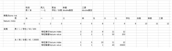 这里有三组特征,或者说3个field的特征,分别是性别、星期几、职业。对应的特征数量分别为2、7、2。我们总的特征数量feature-size为2 + 7 + 2=11。如果转换为one-hot的话,每一个取值都会对应一个特征索引feature-index。