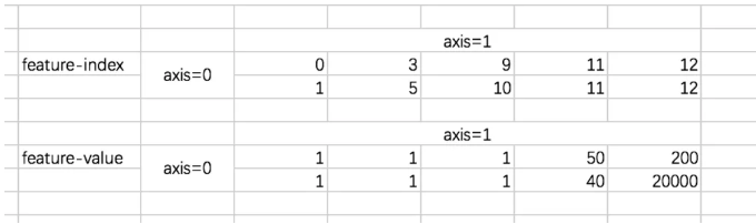 而训练模型的输入有三个,分别是刚才转换得到的特征索引和特征值,以及label: