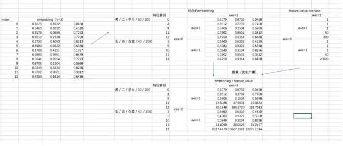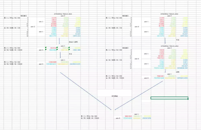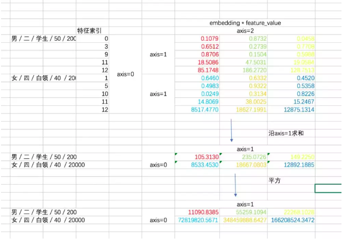 这里注意的是,在得到对应的embedding之后,还乘上了对应的特征值,这个主要是根据FM的公式得到的。过程表示如下: