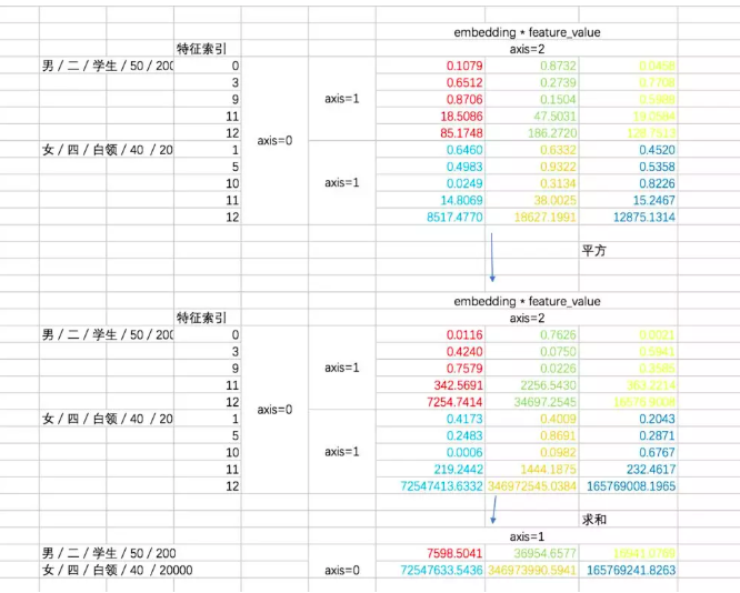 squared_sum_features_emb = tf.reduce_sum(squared_features_emb,1)fm_second_order = 0.5 * tf.subtract(summed_features_emb_square,squared_sum_features_emb)