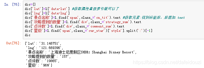 景点名称属于元素,存储在class为cn_tit的span标签中,需要用find()函数找到标签,找到标签后,在其后面加.text就可以获取到景点的名称啦;攻略提到的次数是div标签中的,它的span标签其实是空的,只是嵌套在了div标签下;点评数是在class为comment_sum的span标签下;星级是在class为cur_star的span标签下的style中,找到星级标签后采用的是split对width:96%进行分割
