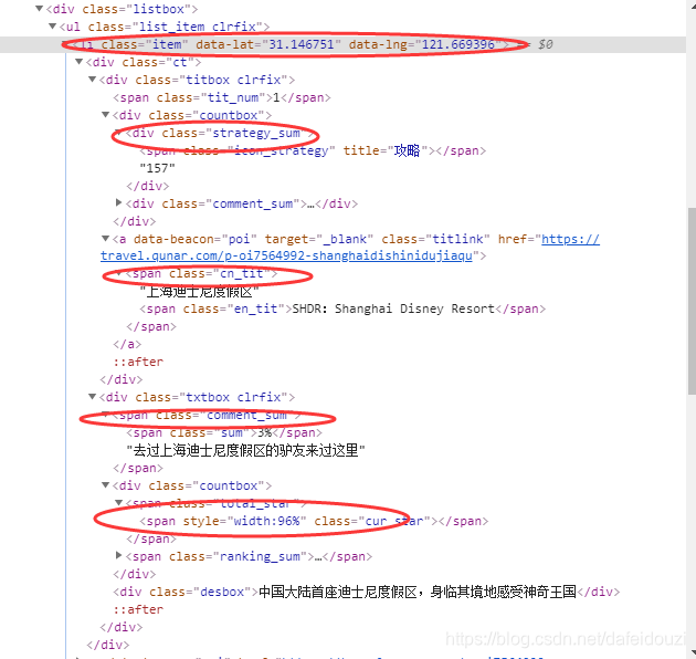 我们试试采集第一页的信息,可以看到下面截图中圈出来部分可以完全包含我们所要爬取的信息,所以可以从class为list_item clrfix的ul标签中获取信息,每一个li标签对应着每一个景点的信息