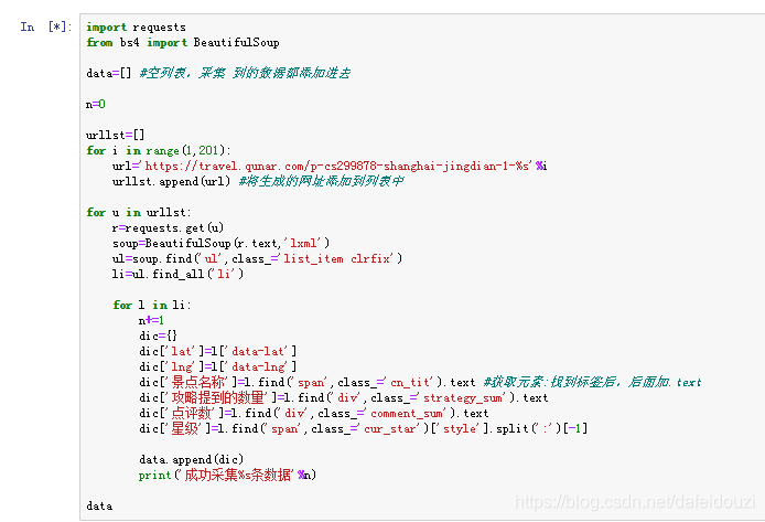 for i in range(1,201):url='https://travel.qunar.com/p-cs299878-shanghai-jingdian-1-%s'%iurllst.append(url) #将生成的网址添加到列表中for u in urllst:r=requests.get(u)soup=BeautifulSoup(r.text,'lxml')ul=soup.find('ul',class_='list_item clrfix')li=ul.find_all('li')for l in li:n+=1dic={}dic['lat']=l['data-lat']dic['lng']=l['data-lng']dic['景点名称']=l.find('span',class_='cn_tit').text #获取元素:找到标签后,后面加.textdic['攻略提到的数量']=l.find('div',class_='strategy_sum').textdic['点评数']=l.find('div',class_='comment_sum').textdic['星级']=l.find('span',class_='cur_star')['style'].split(':')[-1]data.append(dic)print('成功采集%s条数据'%n)dataimport pandas as pd