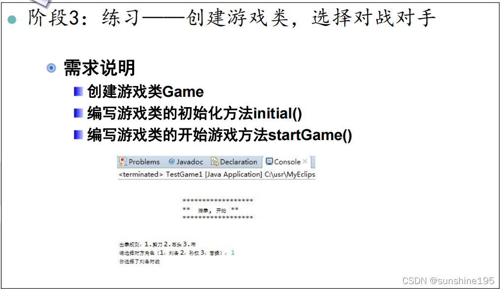 }public void start() {String nextJu;do {System.out.println("-----------欢迎进入游戏世界-----------");System.out.println("**********************");System.out.println("** 猜拳游戏开始 **");System.out.println("**********************");System.out.println("出拳规则:1.剪刀 2.石头 3.布");//给计算机+用户给定名称choseRole();System.out.println("要开始吗?y/n");String answer = input.next();if ("n".equals(answer)) {System.out.println("程序结束");input.close();return;}String nextCircle;int count = 0;do {count++;//开始出拳int userFist = userInfo.showFist(input);int computerFist = computer.showFist();// 1 2 3// 3 1 2battle(userFist, computerFist);System.out.println("是否继续下一轮?y/n");nextCircle = input.next();} while ("y".equals(nextCircle));//不继续下一轮的操作calFinalResult(count);System.out.println("是否开始下一局?y/n");nextJu = input.next();userInfo.setUserScore(0);computer.setComputerScore(0);} while ("y".equals(nextJu));System.out.println("程序结束");input.close();}private void calFinalResult(int count) {String username = userInfo.getUsername();String computerName = computer.getComputerName();int userScore = userInfo.getUserScore();int computerScore = computer.getComputerScore();System.out.println(username + " VS " + computerName);System.out.println("对战次数:" + count);System.out.println("姓名\t得分");System.out.println(username + "\t" + userScore);System.out.println(computerName + "\t" + computerScore);if (userScore == computerScore) {System.out.println(username + "与" + computerName + "最终是平手");} else if (userScore > computerScore) {System.out.println(username + "赢了");} else {System.out.println(computerName + "赢了");}}private void battle(int userFist, int computerFist) {int num = userFist - computerFist;if (userFist == computerFist) {System.out.println("平局");} else if (num == 1 || num == -2) {userInfo.setUserScore(userInfo.getUserScore() + 1);System.out.println(userInfo.getUsername() + "赢了");} else {computer.setComputerScore(computer.getComputerScore() + 1);System.out.println(computer.getComputerName() + "赢了");}}//给计算机选择角色private void choseRole() {System.out.println("请选择对方角色:(1.刘备 2.孙权 3.曹操):");int choice = input.nextInt();String roleName = "";switch (choice) {case 1:roleName = "刘备";break;case 2:roleName = "孙权";break;case 3:roleName = "曹操";break;}System.out.println("请录入你的名称:");String username = input.next();computer.setComputerName(roleName);userInfo.setUsername(username);System.out.println(username + " VS " + roleName);}