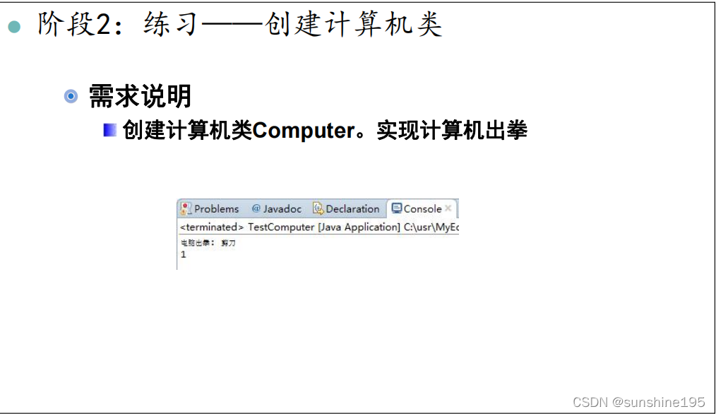 public class Computer {private String computerName;private int computerScore;public int showFist() {//随机的int num = (int) (Math.random() * 3 + 1);String result = FistUtil.fist(num);System.out.println(computerName + "出拳:" + result);return num;}