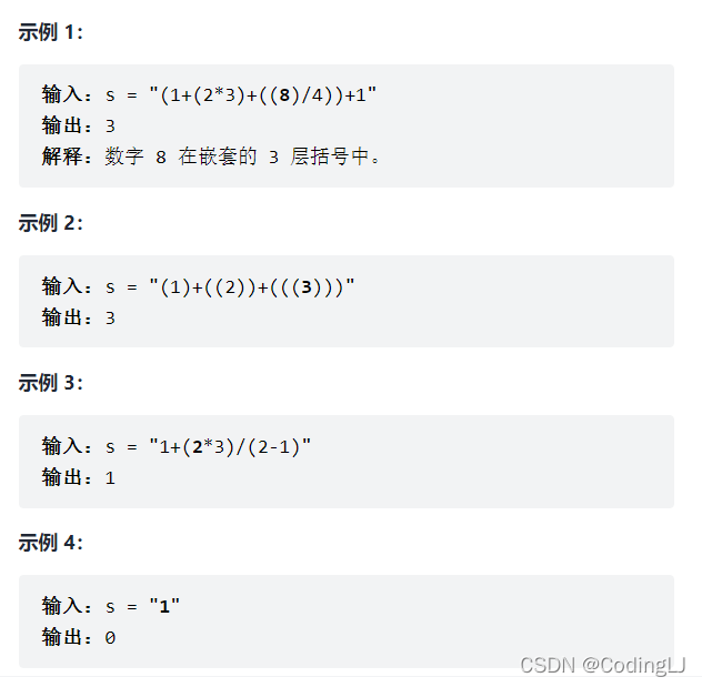 class Solution {public int maxDepth(String s) {int len = s.length();int size = 0;int max = 0;for(int i = 0;i < len;i++){// 等于 ‘(’的话,size++;if(s.charAt(i) == '('){size++;// 计算最大值max = Math.max(max,size);}else if(s.charAt(i) == ')'){// 关键一步,继续计算下一个括号size--;}}return max;}