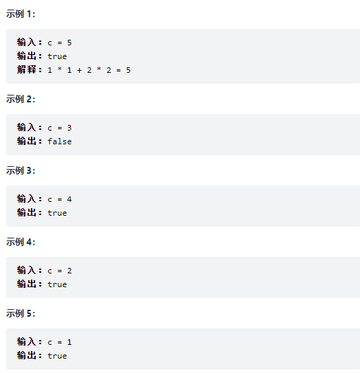 class Solution {public boolean judgeSquareSum(int c) {long a = 0, b = (long)Math.sqrt(c);while (a <= b) {long cur = a * a + b * b;if (cur == c) {return true;} else if (cur > c) {b--;} else {a++;}}return false;}