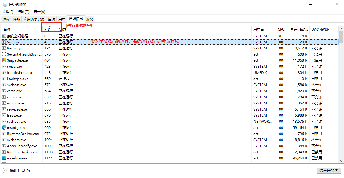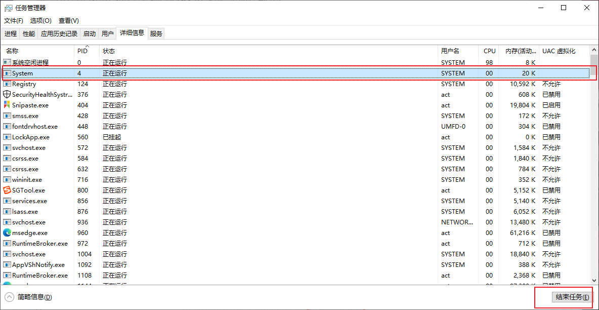 4、打开任务管理器,切换到‘详细信息’选项卡,结束当前进程或程序