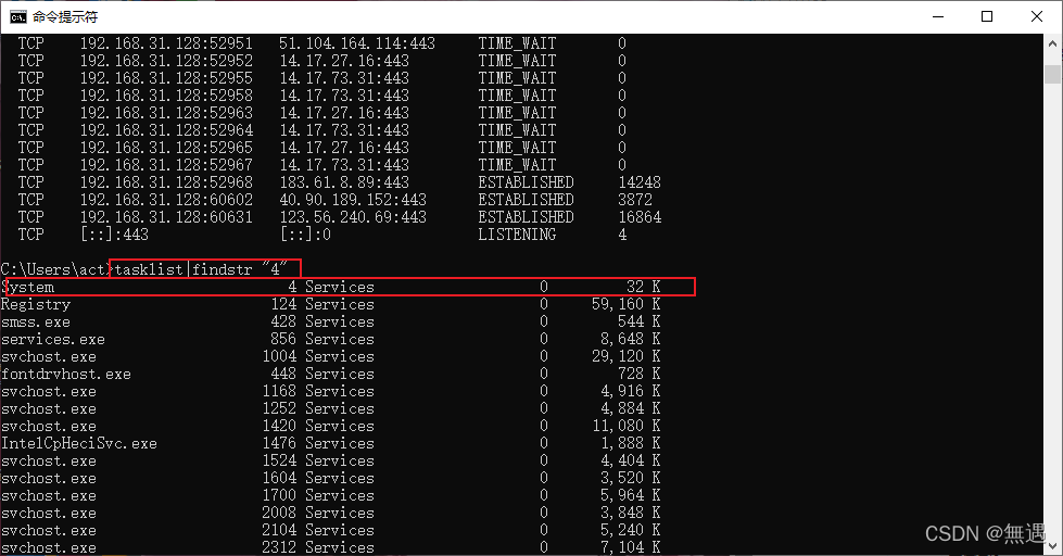 3、查看是哪个进程或程序占用了端口 命令 :tasklist|findstr "4"