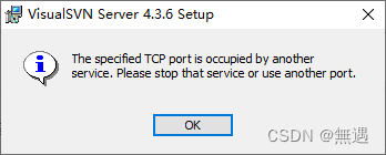 本文主要是介绍安装VisualSVN Server 提示The specified TCP port is occupied+端口被占用,希望对大家解决编程问题提供一定的参考价值,需要的开发者们随着小编来一起学习吧!