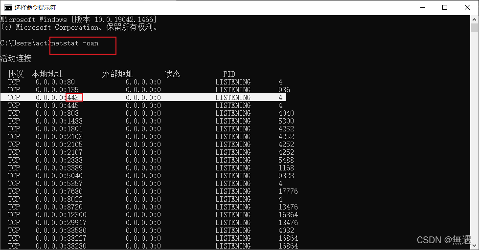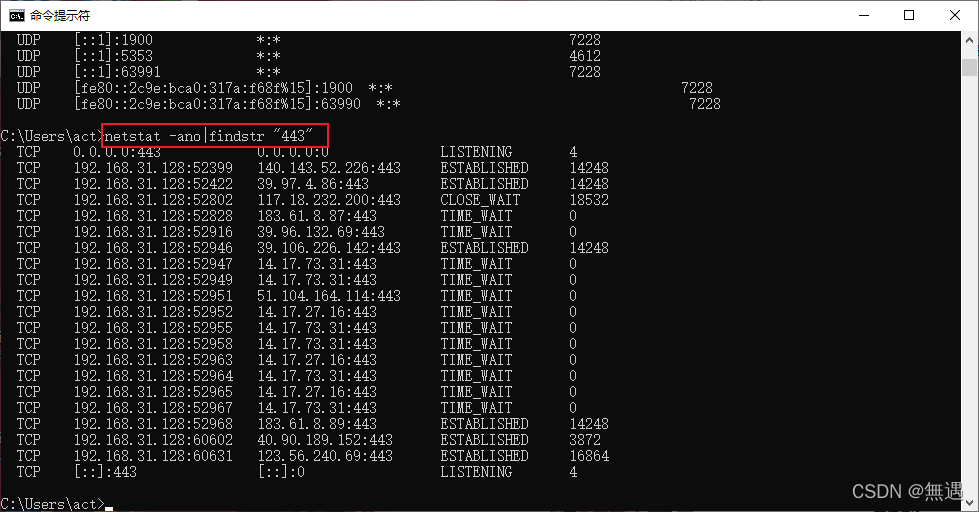 精确找到被占用的端口对应的PID 命令 :netstat -ano|findstr "port"