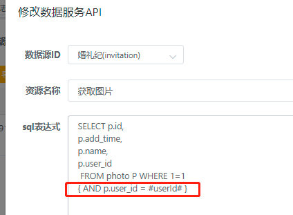 - 对于传入的参数占位符名称必须和前端传入的一致,且需要在参数两边用#包住,例如:#userId#.