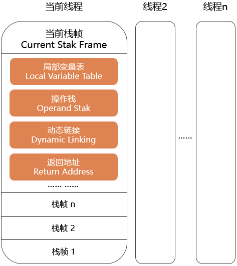 每个方法从调用开始到执行完成的过程中,都对应着一个栈帧在虚拟机栈里面从入栈到出栈的过程。
