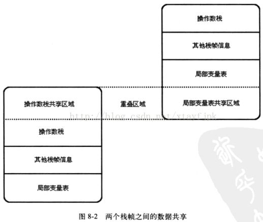 (2)两个栈帧之间的数据共享。在概念模型中,两个栈帧是完全独立的,但是在虚拟机的实现里会做一些优化处理,令两个栈帧出现一部分重叠。这样在进行方法调用时,就可以共用一部分数据,无须进行额外的参数复制传递。