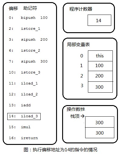 第六步:将第三个数300从局部变量表复制到栈顶。接下来就是将两个300出栈,进行整型乘法,将最后的结果90000入栈。