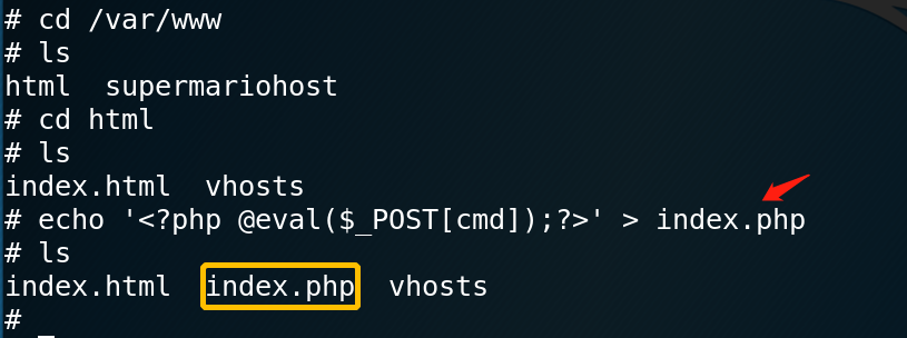 在/var/www/html下写一句话木马,保存在文件index.php中。
