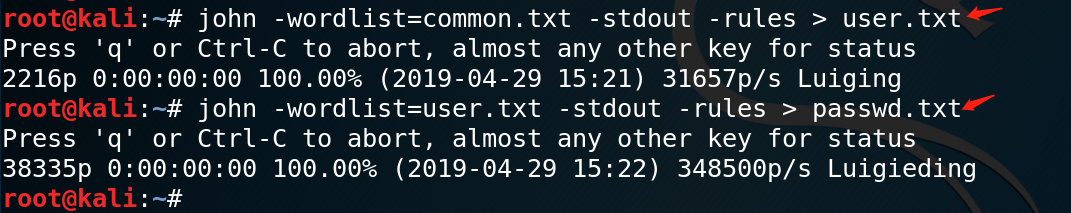- john -wordlist=user.txt -stdout -rules > passwd.txt