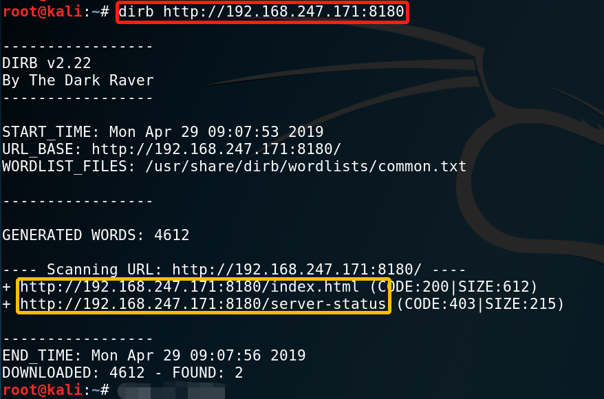 在浏览器上直接访问192.168.247.171:8180,可以看到主页没有什么有用信息。接下来使用dirb分别对默认字典和大字典对靶机进行目录探测,探测结果如下: